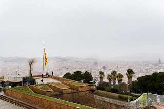 Na mieście cieplej niż wczoraj, ale niestety kropił deszcz. Najpierw metrem pojechaliśmy do kolejki (podobnej jak na Gubałówce), która zabrała nas do kolejki linowej prowadzącej na wzgórze Montjuic. Panorama miasta dość zamglona, ale strzelista Sagrada wyróżniała się wśród masy zwykłych budynków.